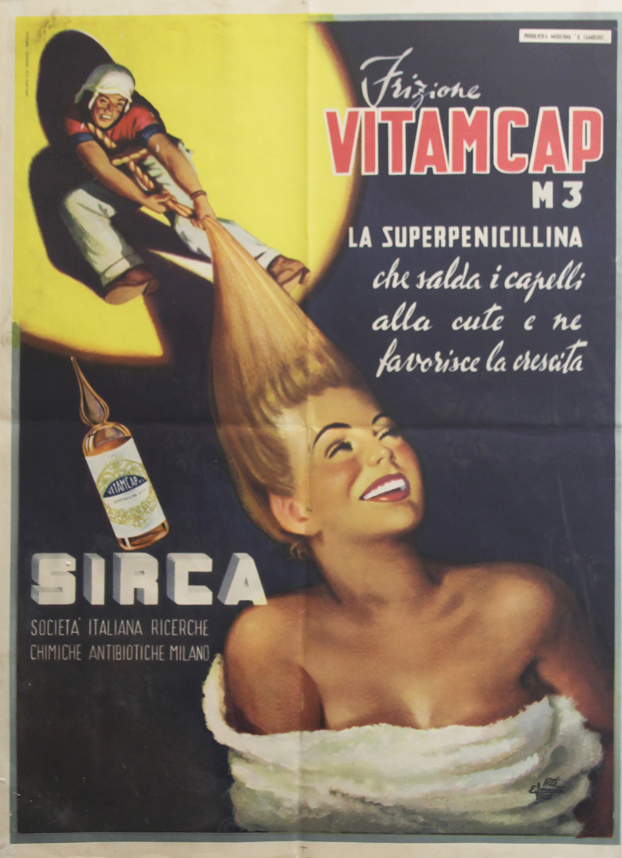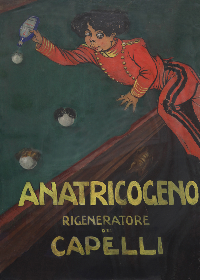 fig. 28 - 1924, "Palle da biliardo con capelli" Anatricogeno prodotto per la crescita dei capelli. Bozzetto a tempera f.to cm. 100x142 eseguito probabilmente all'atelier GIB-Milano, riprodotto in cromolitografia a 7-8 colori