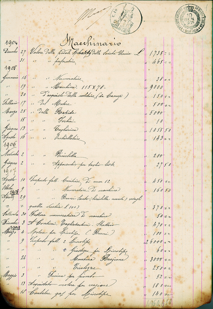 fig. 31 - 1904, Primo libro inventario, pag. 1 - Nell'annotazione del 27 dicembre 1904 figura la prima macchina: una pedalina della ditta Urania