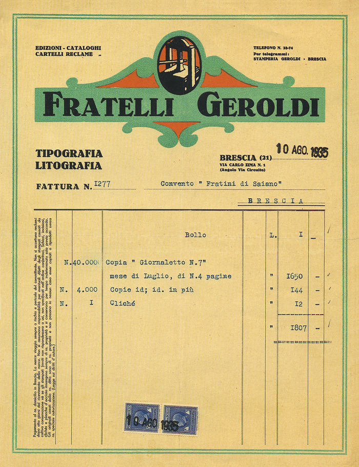 fig. 23 - 1935,Fattura al Convento "Fratini di Saiano"
