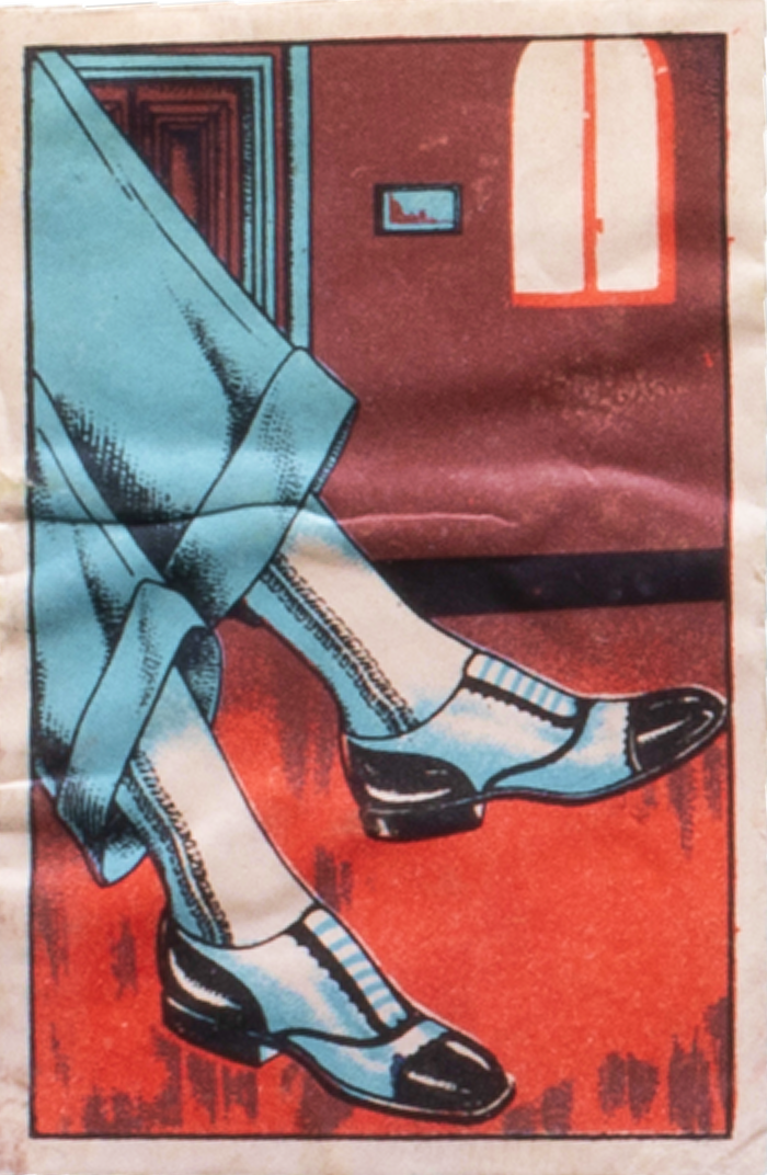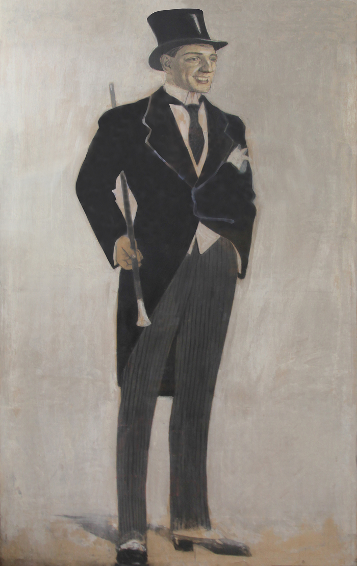 fig. 41 - 1922, "Uomo in tight" Bozzetto a tempera f.to cm. 100x166, del pittore Piero Galanti. Cromolitografia da pietra in f.to cm. 70x100 per il sig. G. Graziotti titolare di ben tre negozi; i primi negozi a Brescia di abiti pronti, situati tra corso Palestro e l'allora via Umberto 1°, attuale via Gramsci.Â