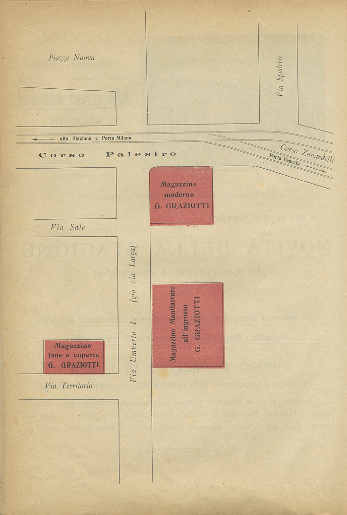 fig. 38 - 1906, Pianta con dislocazione dei 3 magazzini a Brescia