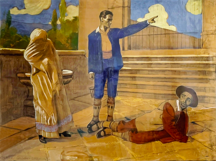 fig. 50 - 1924, "La cavalleria rusticana" In questa scena compaiono Vittorio Gatti, attore, registra e librettista e il giornalista Luigi Vecchi, a terra, e l'attrice Elena Broffoli in veste di attori cinematografici, fra i pionieri di questa attivitĂ anche in campo nazionzle. Bozzetto a tempera f.to cm. 140x100 riprodotto in cromolitografia a 6 colori.