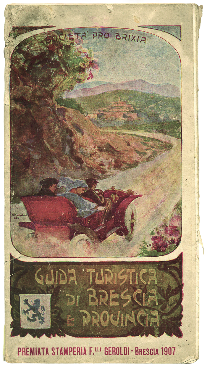 fig. 1 - 1907, Un volumetto dello Gnaga in occasione del “Circuito Automobilistico di Brescia contenente oltre alla descrizione della cittĂ una serie di 12 itinerari automobilistici consigliati nella provincia.Â