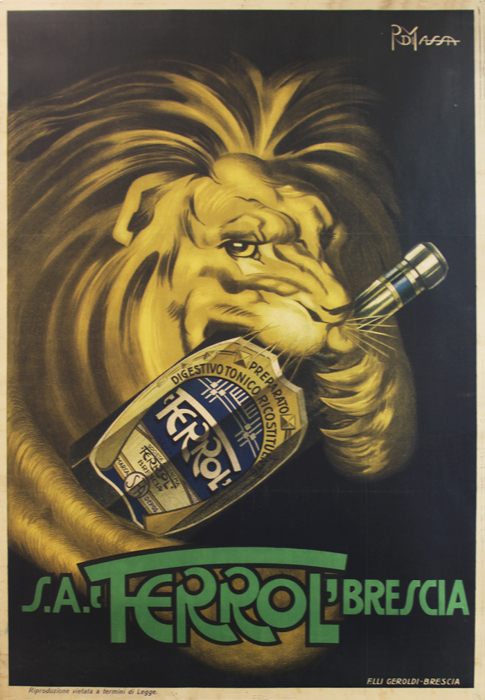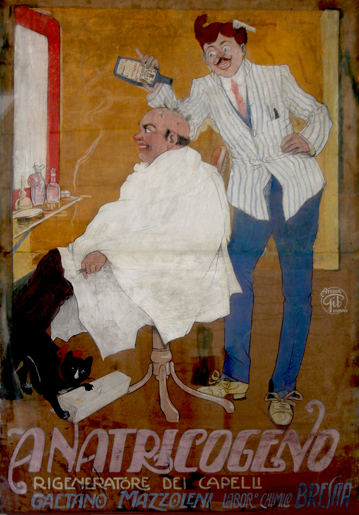 fig. 6 - 1924, "Barbiere" Anatricogeno prodotto per la crescita dei capelli. Bozzetto a tempera f.to cm. 100x142 eseguito dall'atelier GIB-Milano, riprodotto in cromolitografia a 7-8 colori, verso il 1924.