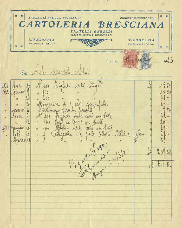 fig. 3 - 1923, Fattura della Cartoleria Bresciana