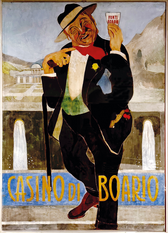 fig. 65 - 1923, "Uomo con boccale" Bozzetto a tempera f.to cm. 100x142, di pittore anonimo, per un manifesto eseguito poi in cromolitografia a 7-8 colori,da pietra, in f.to cm. 70x100 per la pubblicitĂ delle Terme