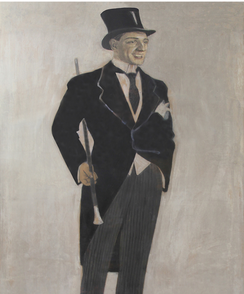 fig. 41 - 1922, "Uomo in tight" Bozzetto a tempera f.to cm. 100x166, del pittore Piero Galanti, per un manifesto eseguito poi in cromolitografia da pietra in f.to cm. 70x100 per il sig. G. Graziotti titolare di ben tre negozi di nome "Magazzino moderno"; i primi negozi a Brescia di abiti pronti, situati tra corso Palestro e l'allora via Umberto 1°, attuale via Gramsci. Anno 1922-1923.